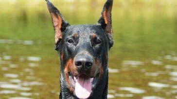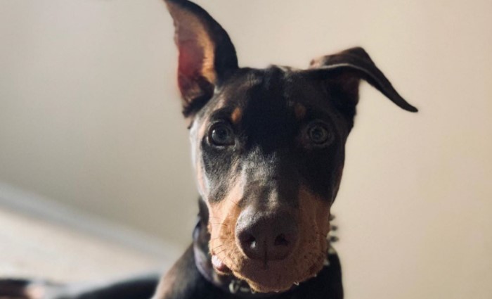 The distinctive external features of Dobermans are a flat forehead that clearly turns into a muzzle, a high-set neck, and ears, along withers, a short back, an oval chest, and a taut belly that forms a beautiful wavy line. Their color always consists of the main color and red markings on the paws, chest, and lower part of the muzzle.